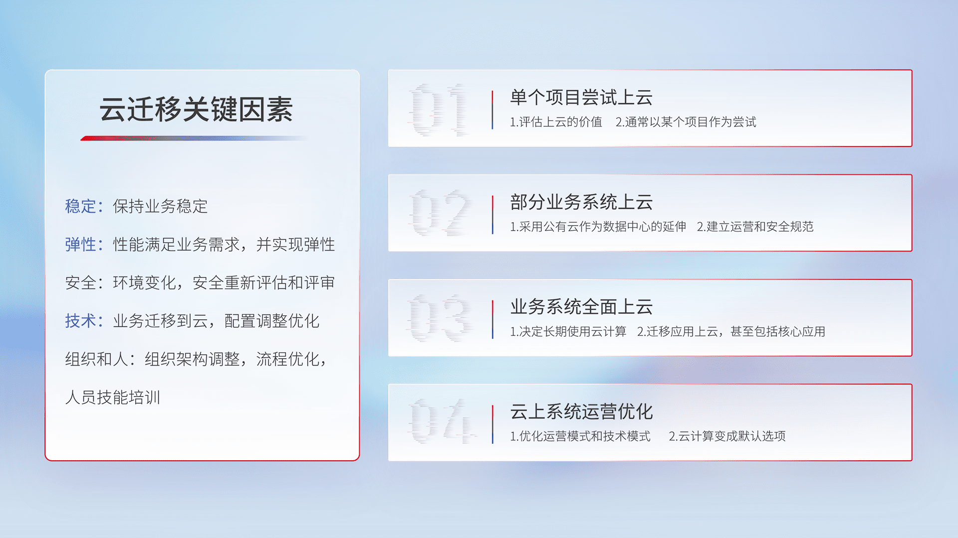 结合实际业务,,,,从规划设计、、云平台选型、、、、云原生改造、、、数据迁移、、、、集成交付,,,迁移全过程为客户识别最佳上云路径,,做好风险识别管理,,,设计网络架构、、身份权限、、、、安全审计合规、、、、操作审计、、、、日志审计、、、、监控告警策略、、多站点容灾设计等,,,,对云上基础设施进行整体规划,,,提升IT治理水平,,以满足弹性、、高可用、、、、高性能的需求。。