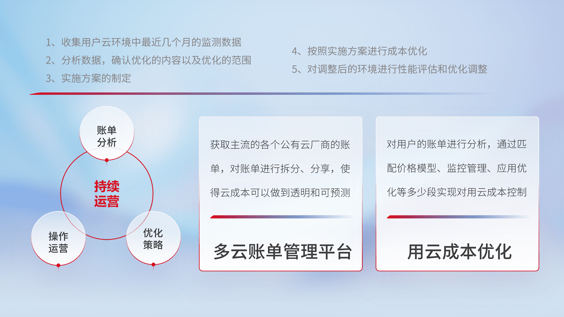通过多云纳管,,以统一的资源数据模型把客户的云资源进行抽象和封装,,,进而实现对多云资源的统一操作,,,,保障云资源管理的可靠性、、、、稳定性与可用性。。量身定制化运维内容,,,配置、、、开发运维、、、、补丁管理、、备份、、、监控、、、、认证和访问管理、、、审计和日常巡检等,,,,保障在用云过程中的可靠度,,,稳定度以及高可用率。。。。